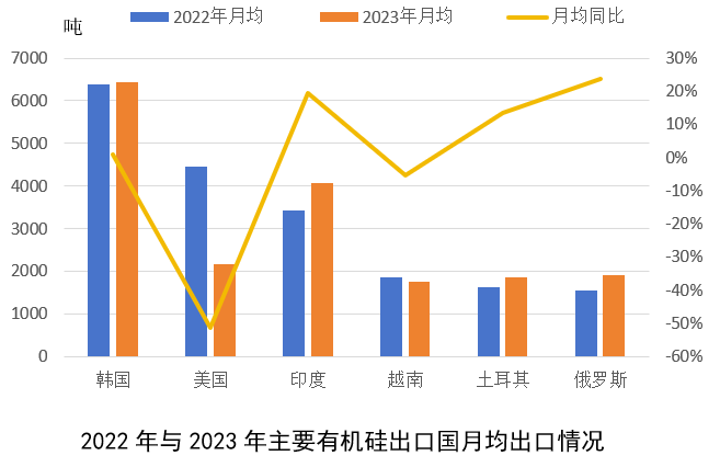 2.對美有機(jī)硅出口自2022年7月之后大幅下滑,2023年月均出口同比大降超50%,美國作為我國有機(jī)硅第二大出口國地位被印度取代;