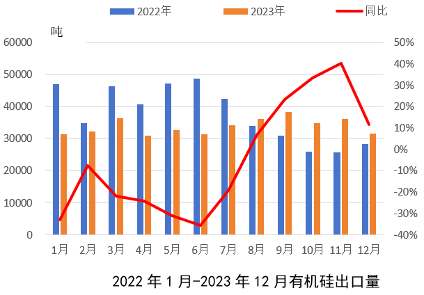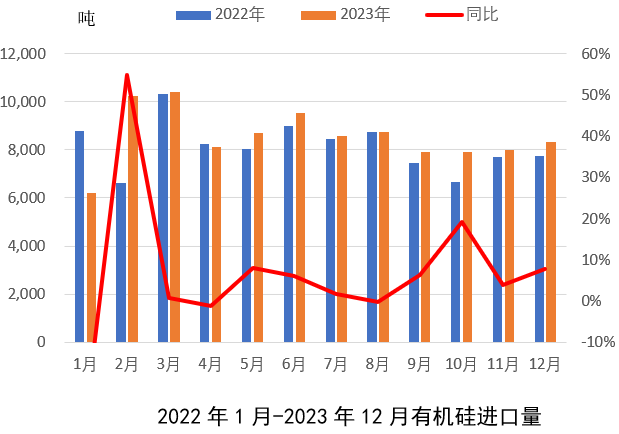 從進(jìn)口量來看,2023年1-12月有機(jī)硅進(jìn)口整體同比小幅增加5.1%。進(jìn)口增加主要因為一方面因疫情管控放開國外高端有機(jī)硅產(chǎn)品進(jìn)口有所恢復(fù),另一方面國外需求下滑,部分外企銷售重心轉(zhuǎn)向國內(nèi)市場。