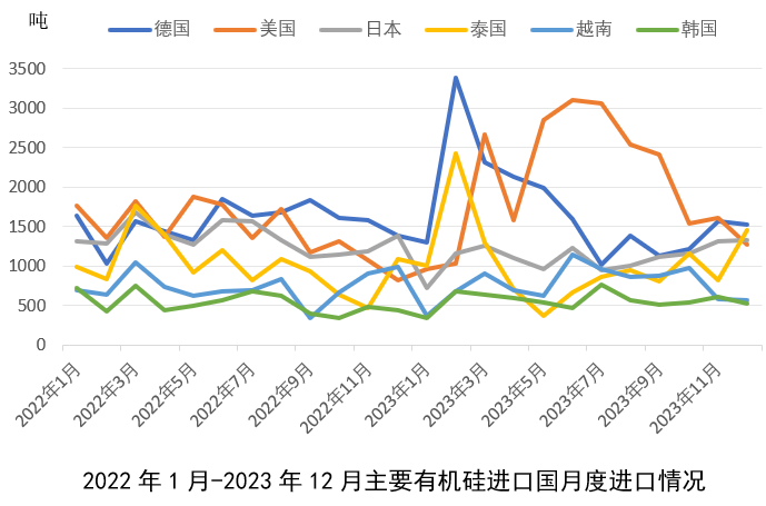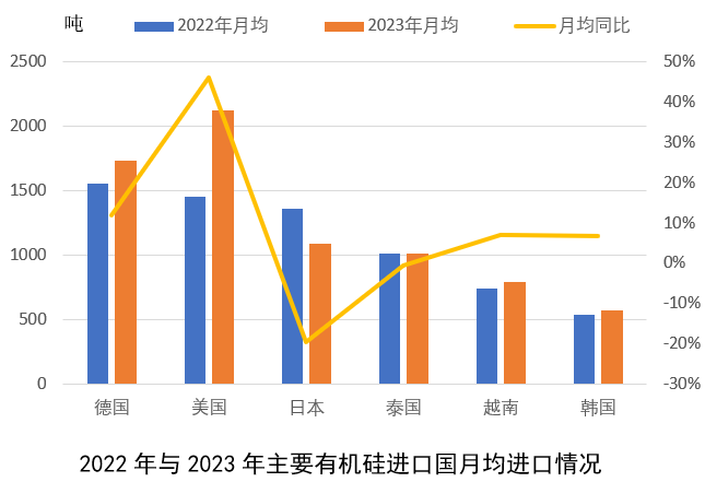 1.2023年1-12月,對美國和德國有機(jī)硅進(jìn)口大幅增加,月均同比增加分別約46%與12%,美國重新成為我國最大有機(jī)硅進(jìn)口國;