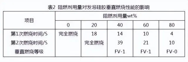 常用于表征聚合物阻燃性能之一的測(cè)試方法為垂直燃燒法,其燃燒模式非常接近物體燃燒的實(shí)際情況, 因此能很好地反映硅橡膠的實(shí)際阻燃效果。阻燃劑用量對(duì)硅橡膠垂直燃燒性能的影響如表2所示。從表2可以看出, 未加阻燃劑的硅橡膠完全燃燒;加入40份阻燃劑的硅橡膠垂直燃燒等級(jí)達(dá)到FV-1級(jí), 具有一定的自熄能力;加入80 份阻燃劑的硅橡膠垂直燃燒等級(jí)更是達(dá)到了FV-0級(jí), 表現(xiàn)出良好的自熄性。