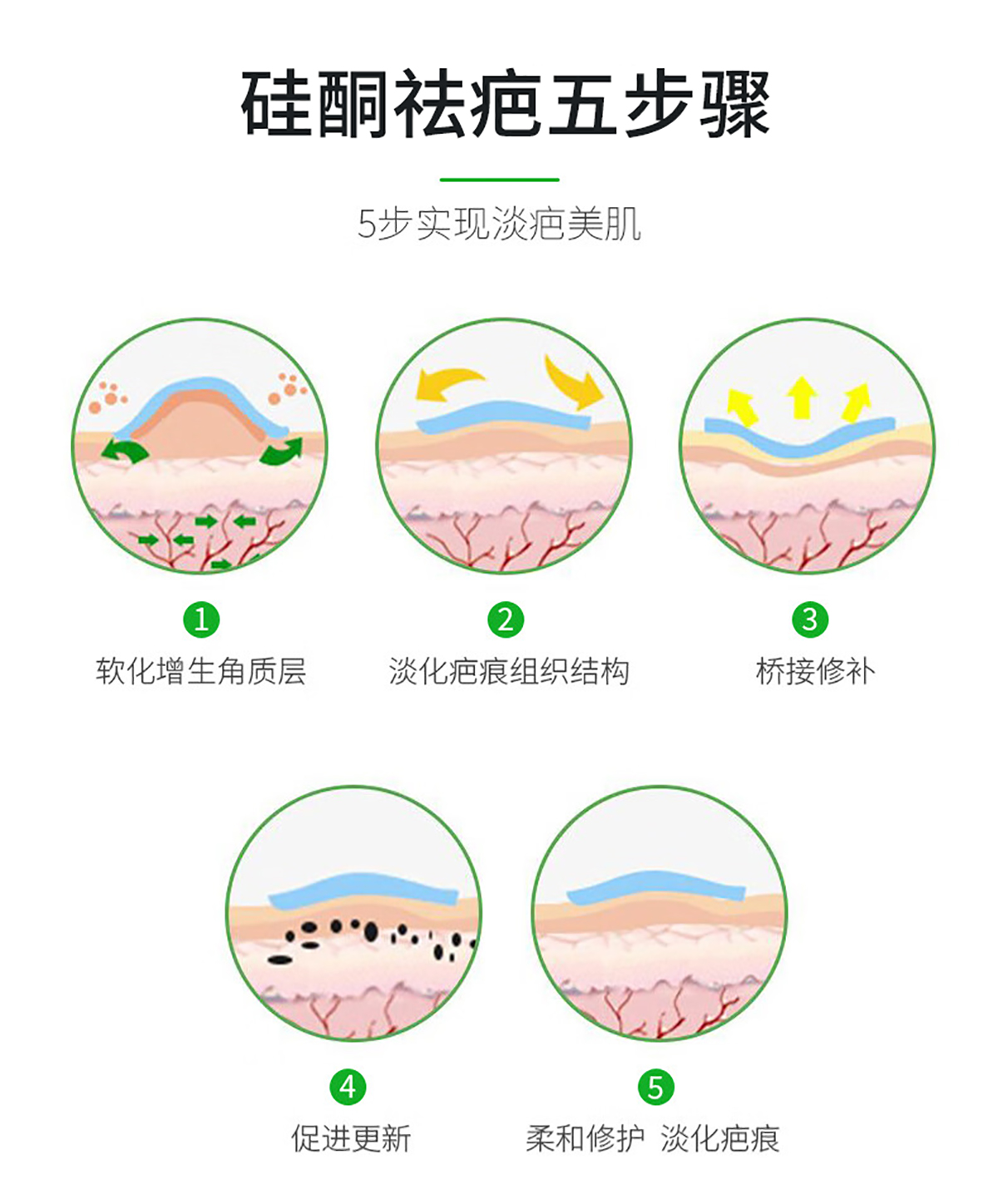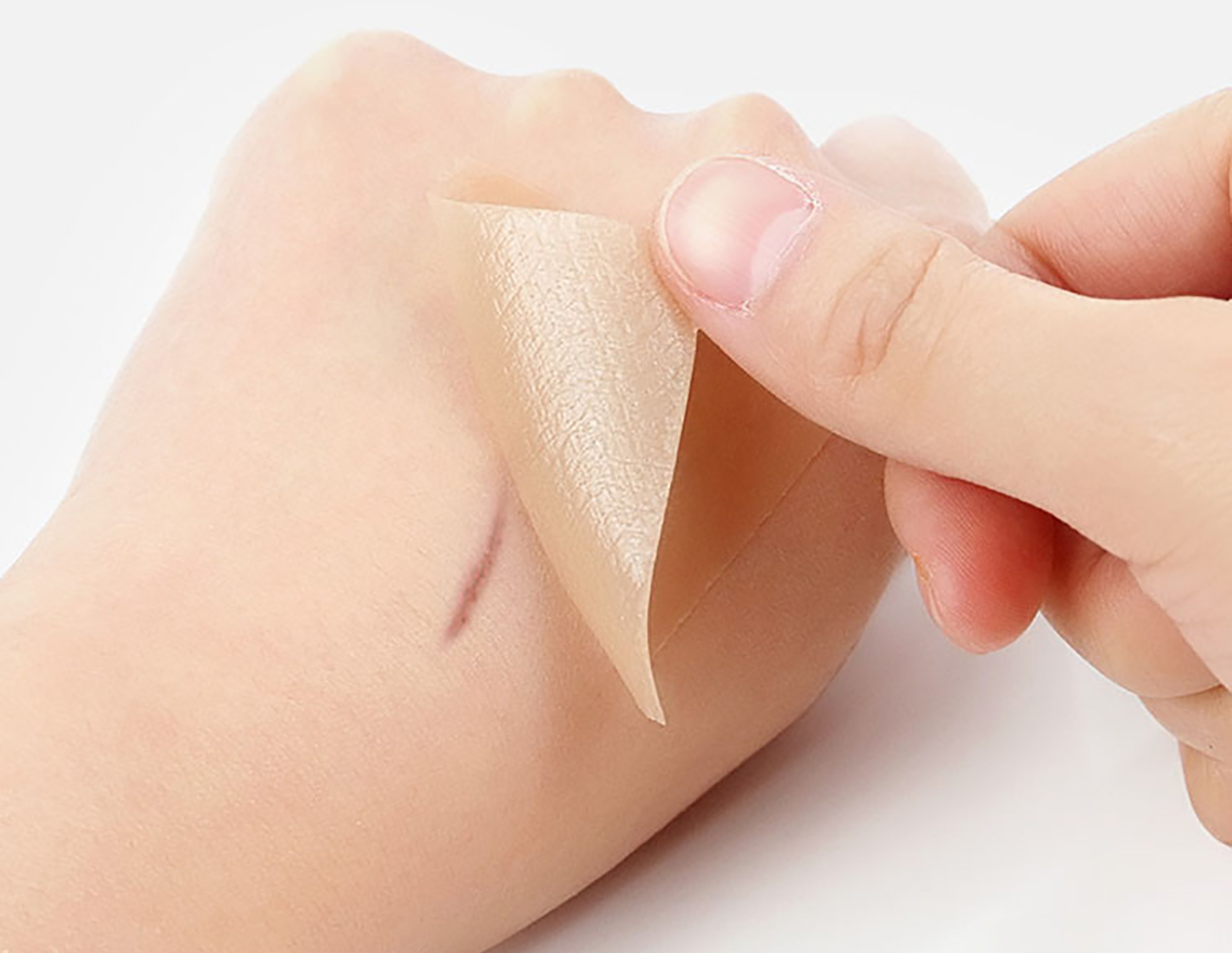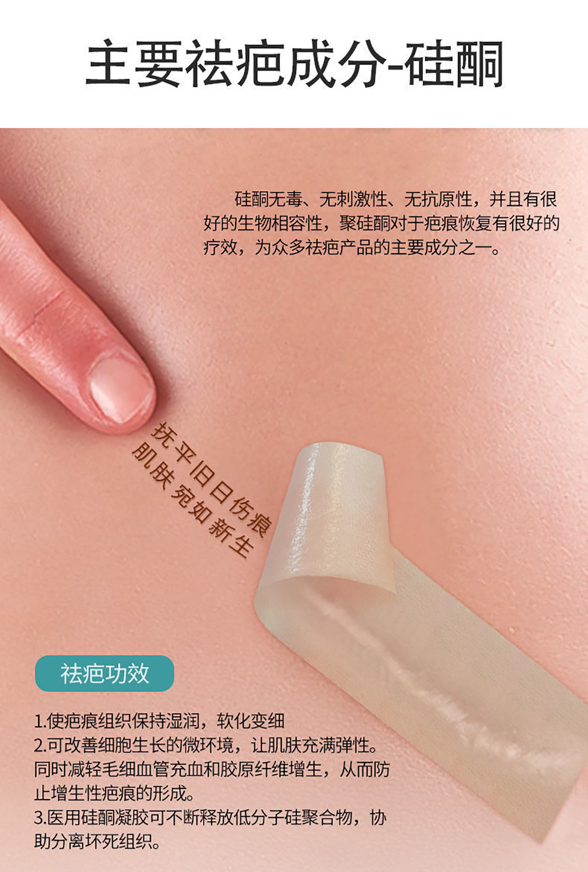 硅膠片,透明柔軟但不透水,對(duì)皮膚有粘性,能夠讓疤痕保持一定程度的溫度濕度、壓力、氧氣量等,以軟化疤痕,預(yù)防疤痕增生,最后達(dá)到減淡疤痕的效果。